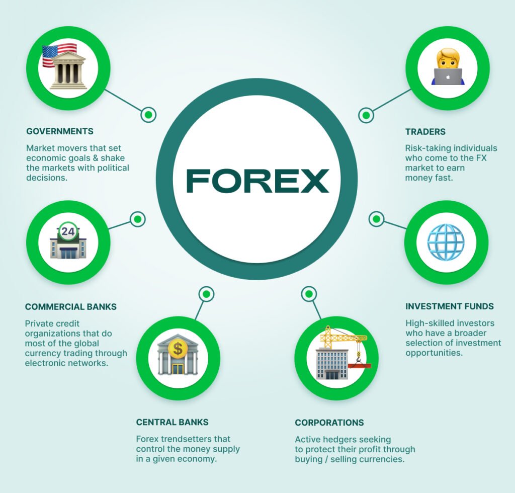 Los participantes del mercado Forex incluyen bancos, empresas, inversores individuales y gobiernos.